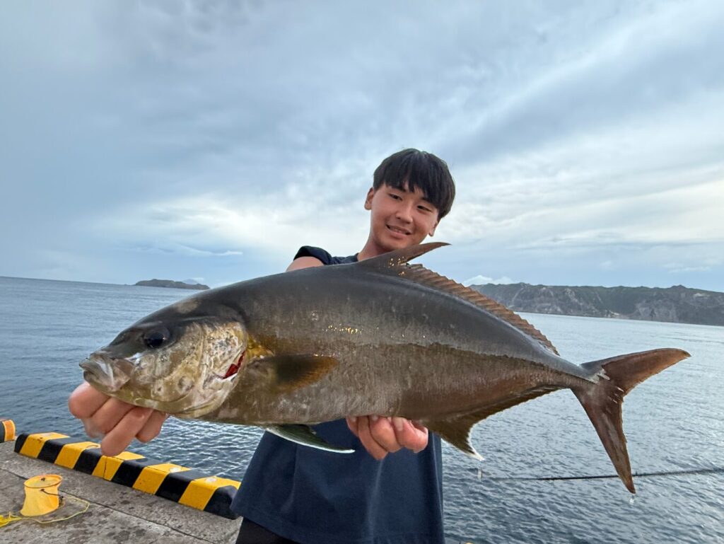 と言った直後になんと2kgアップのヒレナガカンパチを釣り上げていました!