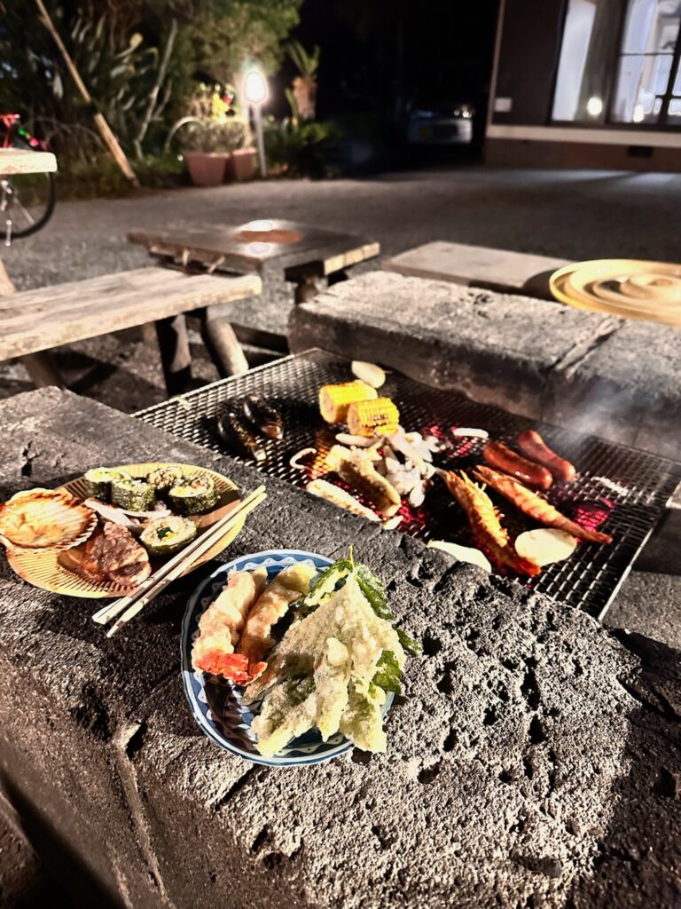 オフシーズンの12月のこと。彼女たちは、のんびり島の名所を観光しながら、式根島の商店で名物を食べたり、BBQに挑戦して楽しんでいました。宿泊はゲストハウスひだぶんです。