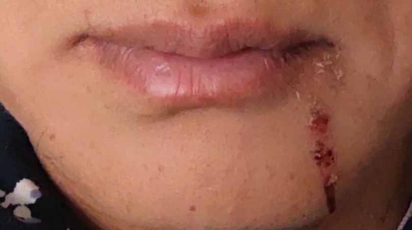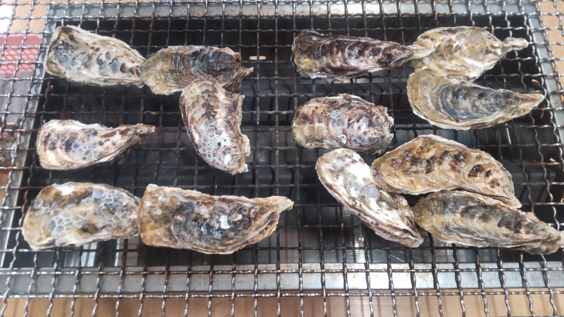貝殻の中でぐつぐつに煮えた牡蠣汁を飲もうとしたら、思わぬところからこぼれて火傷。