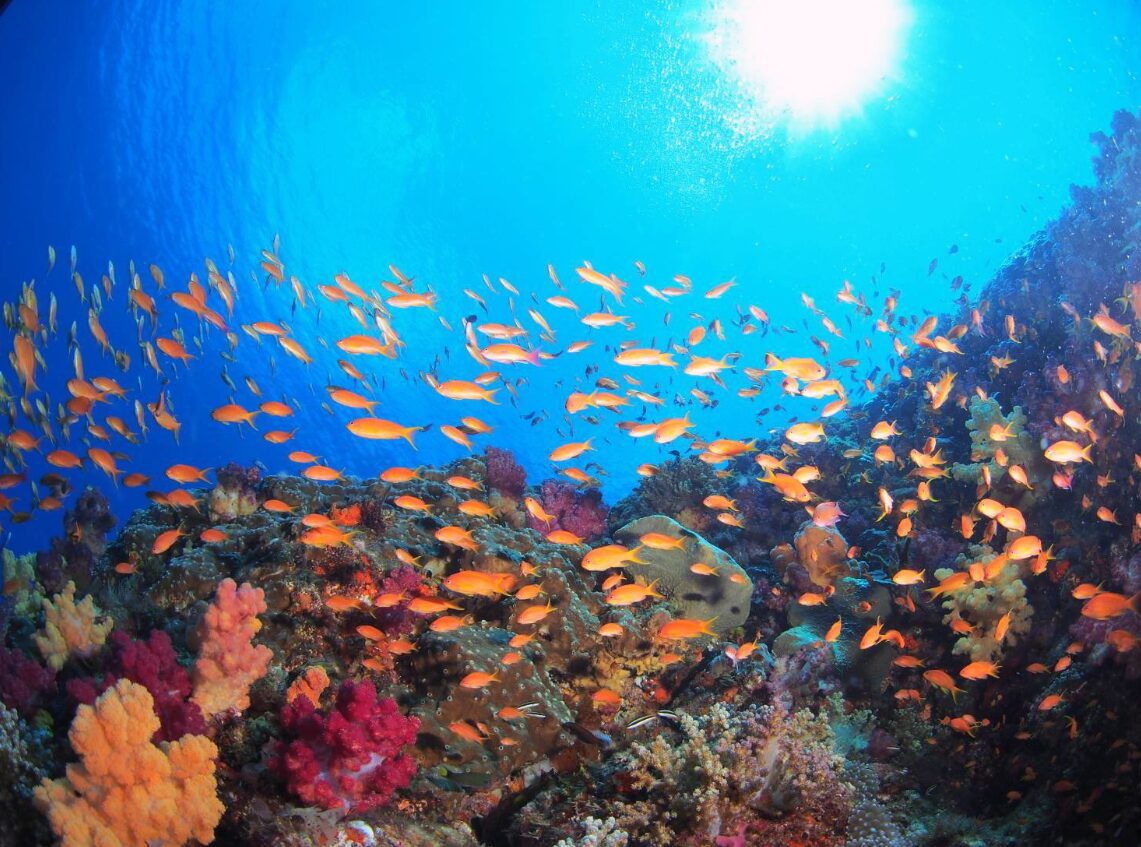 一方、海中温泉のエリアから離れれば、次第に二酸化炭素の濃度が下がっていき、流紋岩の白砂に輝く珊瑚がゆらめき、カラフルな熱帯魚が舞い、大型回遊魚が悠々と泳ぐ式根島ならではの光景が広がっています。