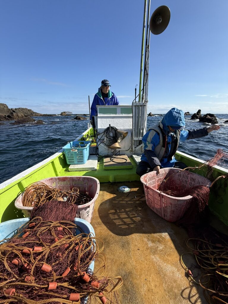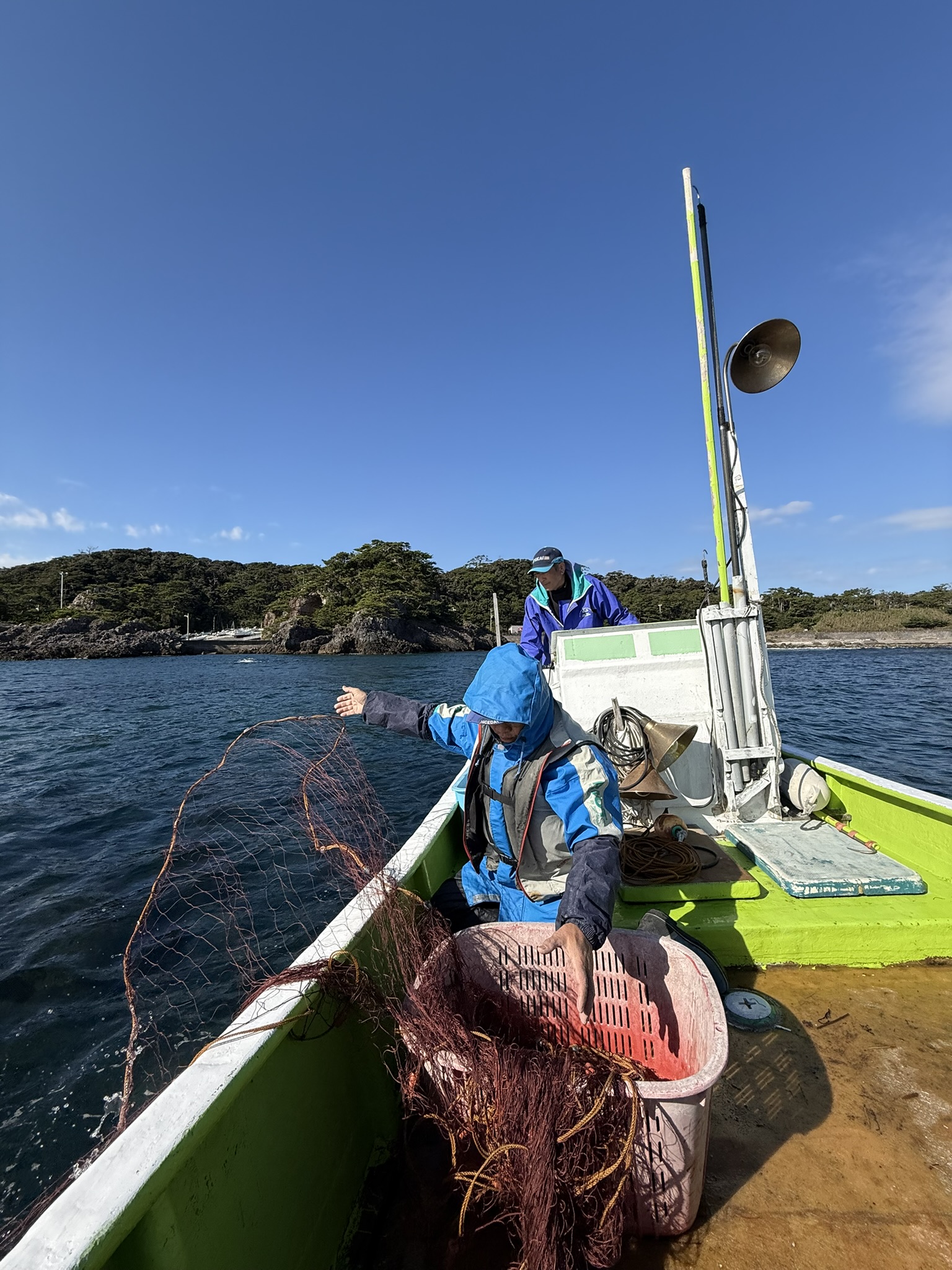 そして、漁協から戻ったら、刺し網に開いた穴や破れを補修し、再び網を掛けに行きます。