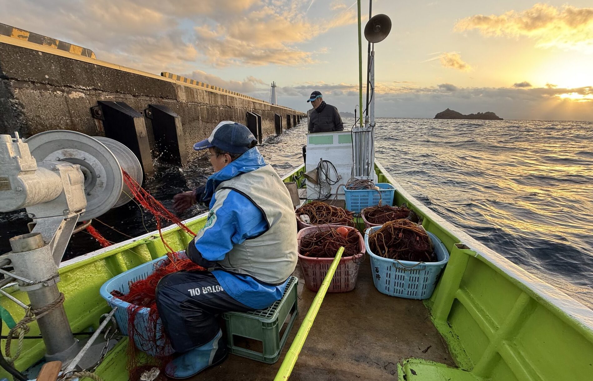 今回、目にしたのは、ブダイ、イスズミ、メジナ、ニザダイ、カサゴ、タカノハダイ、タカセガイ、バンバエビなど。昔と変わらぬラインナップのようですが、大きな変化があります。それは、エビ網に海藻がかからないこと。昔は、エビ網をさらったあとは、大量の海藻のはき掃除をしなくてはいけませんでした。それが今では、全くついていません。黒潮大蛇行の影響なのか、近年は高水温が続き、式根島の海の磯焼けは深刻です。伊勢海老の生息域の変化による不漁も問題視されています。