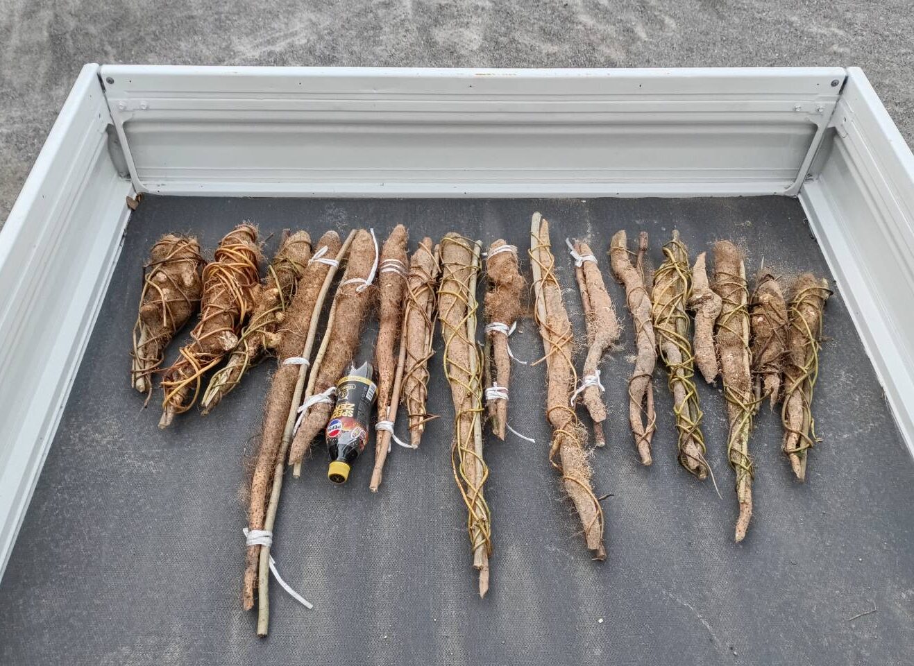 良型の山芋のつるに誘われた名人が、単独で18本も掘り上げました。すんなり育った立派な式根島の山芋たち。