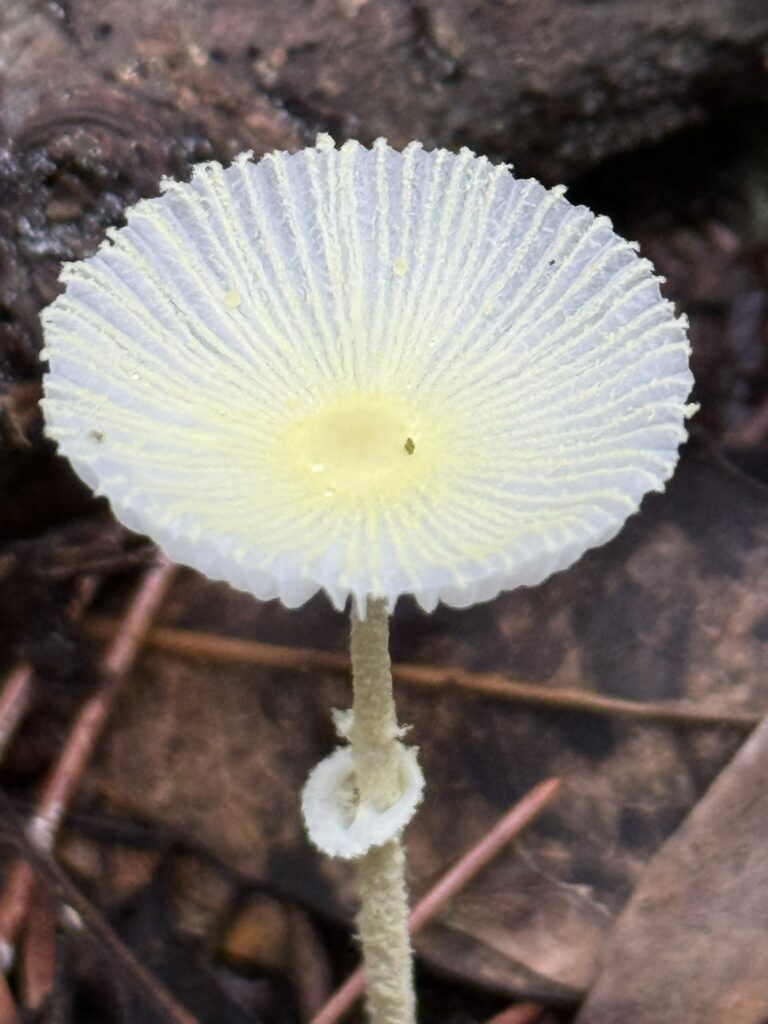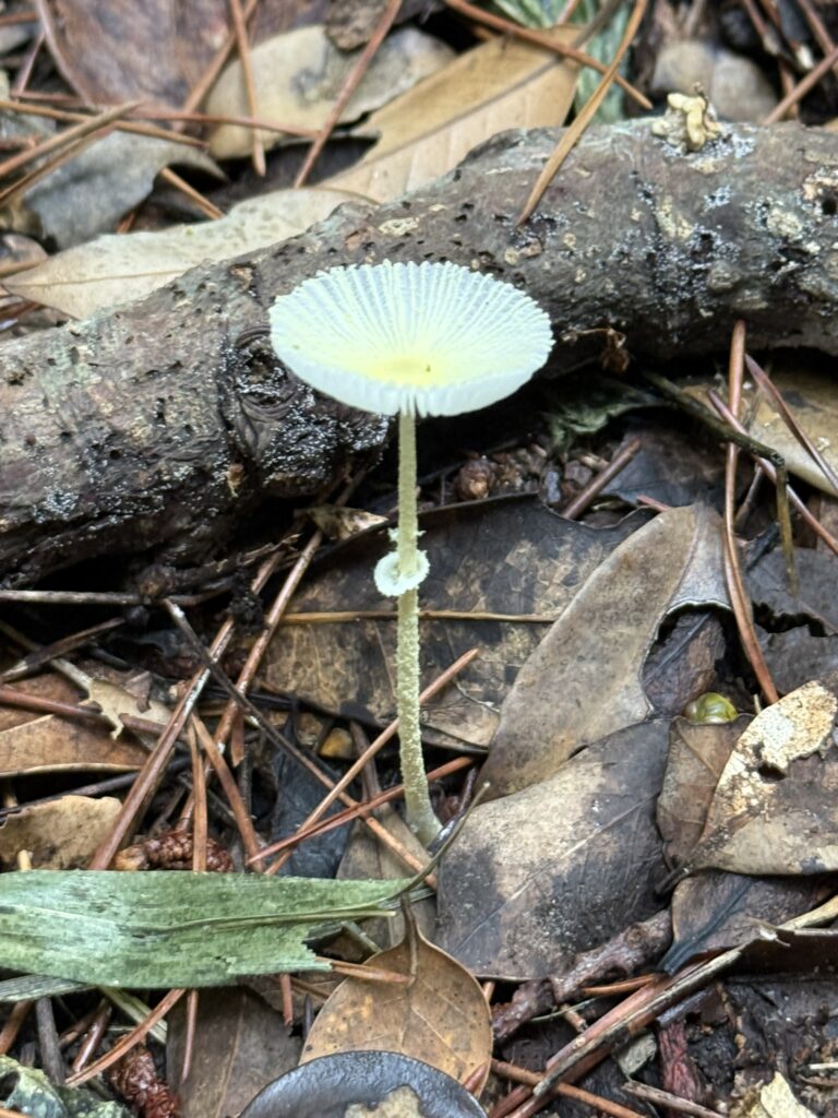 息を吹きかければ倒れてしまう、繊細な美しいきのこ「キツネノハナガサ」です。式根島には狐はおりません。