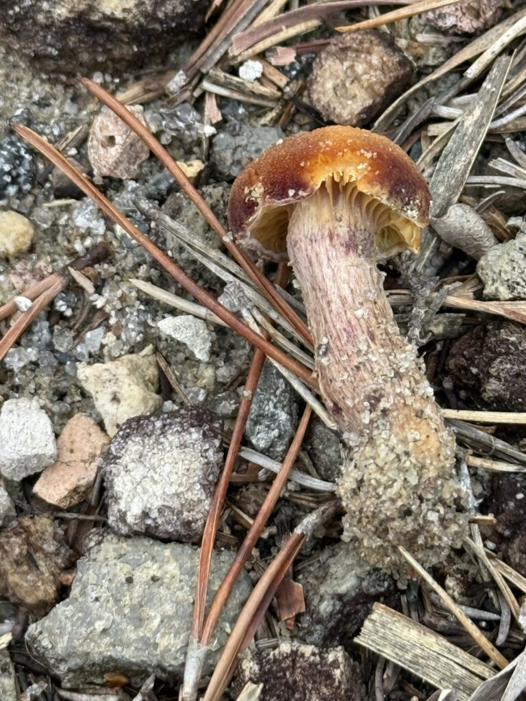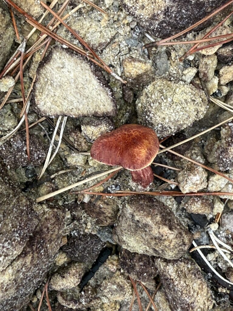 基本的に式根島は「暖地」ですので、温かいところに生えるきのこが多くなります。きのこが多く見つかる場所の樹種は主に「松」「シイ」ですが、式根島の表土は火山放出物未熟土といって、有機物の蓄積が少なく、砂地が多いので限定的です。