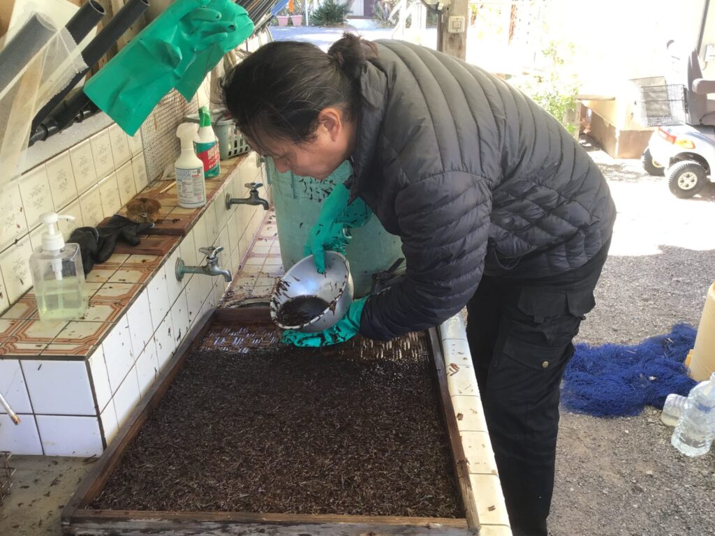 持ち帰った海苔は下処理をしてから干して板海苔にします。天気が悪い時は、ひとまず、ざっと洗ってから冷蔵または冷凍しておき、好天時に続きを行うことも多いです。ちなみに、ひだぶんの女将は漁業協同組合に所属する漁師ですので、シーズン中には何度も海苔摘みをして、せっせと干し海苔作りに勤しみます。