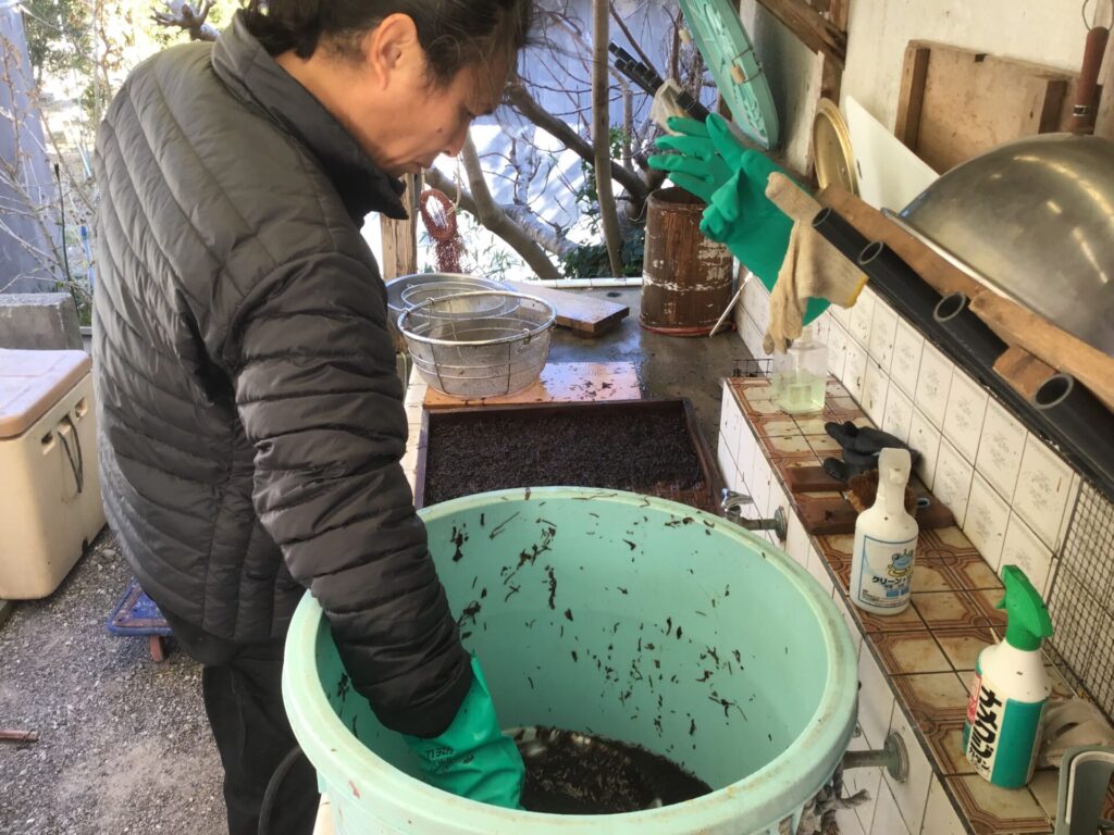 採ってきたままの海苔は基部に石や砂がついているのがあるので、これをハサミで切り取り、何度も何度も水を替えながらよく洗います。ここを適当にすると、食べる時にじゃりっとして美味しくありません。洗った海苔はゴミや石が容器の底に沈むように、水に浮かせてボールですくい、「簾(す)」に広げていきます。