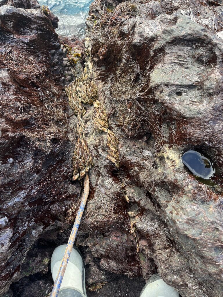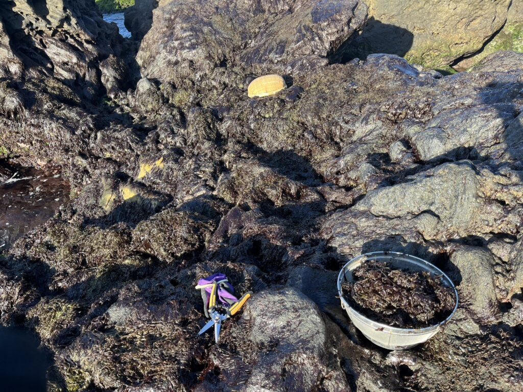 道具はハサミ、手袋、ザルや背負いかご、クーラーボックスです。ハサミで根元を切り落とせば、岩や砂がつかなくて後々の処理が楽ですが、やや、スピードが落ちます。下の動画のように手でむしりとることが多くなります。