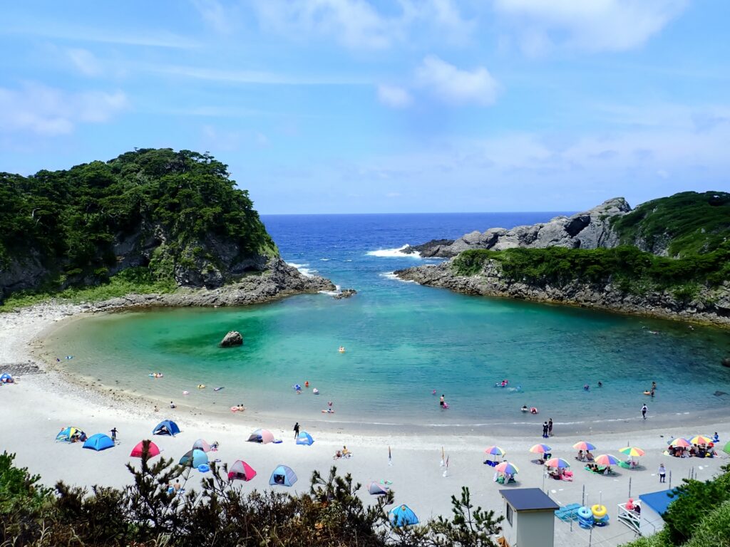予備知識なしで、南の島のリゾート然とした沖縄と式根島のビーチの写真を並べたら、ほとんど一緒じゃないか!と思う方もいるかもしれませんが、沖縄は亜熱帯にあるトップクラスの大規模観光地です。式根島は温帯で、緯度も和歌山くらい。観光開発されていない小さな島です。