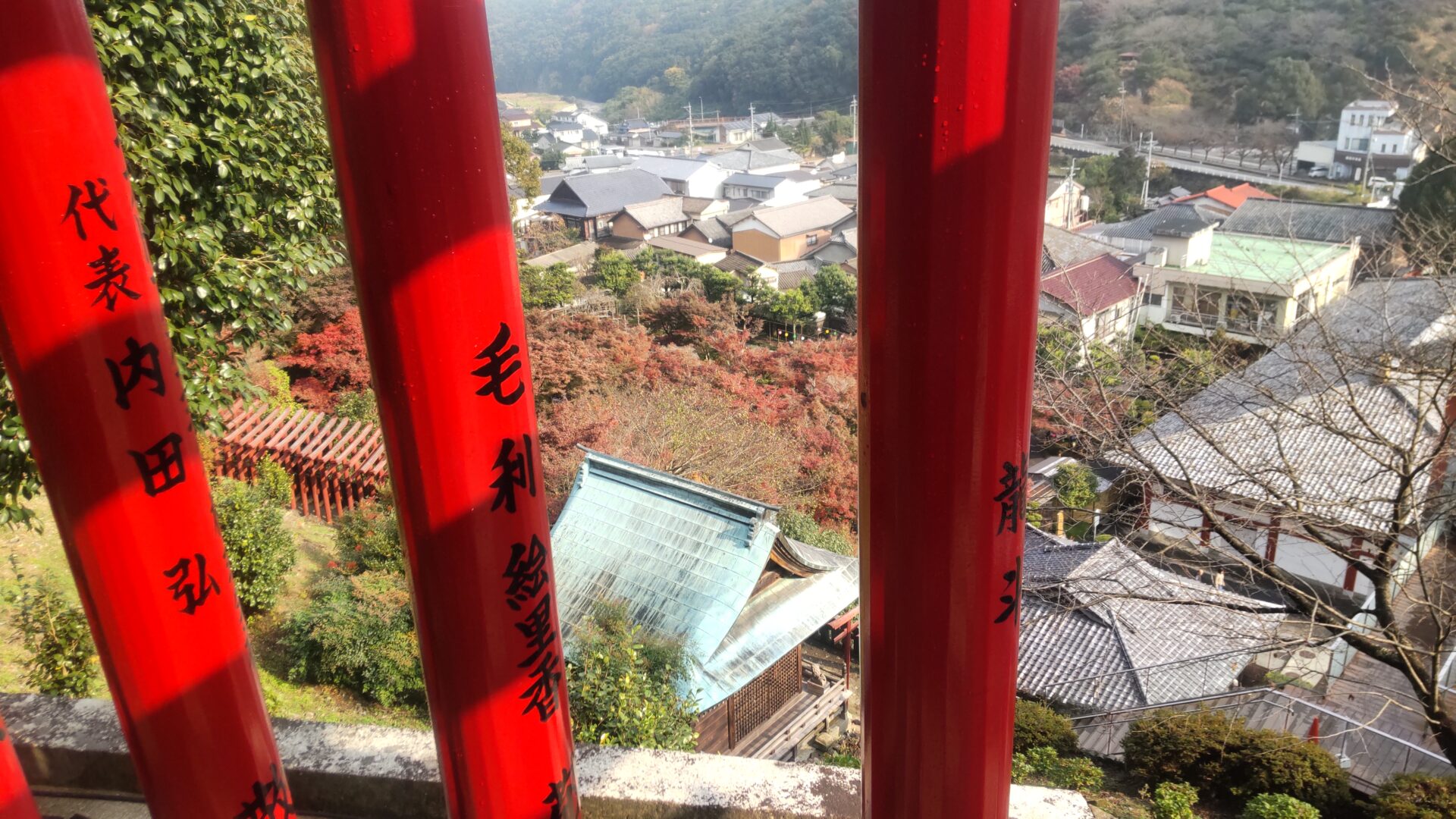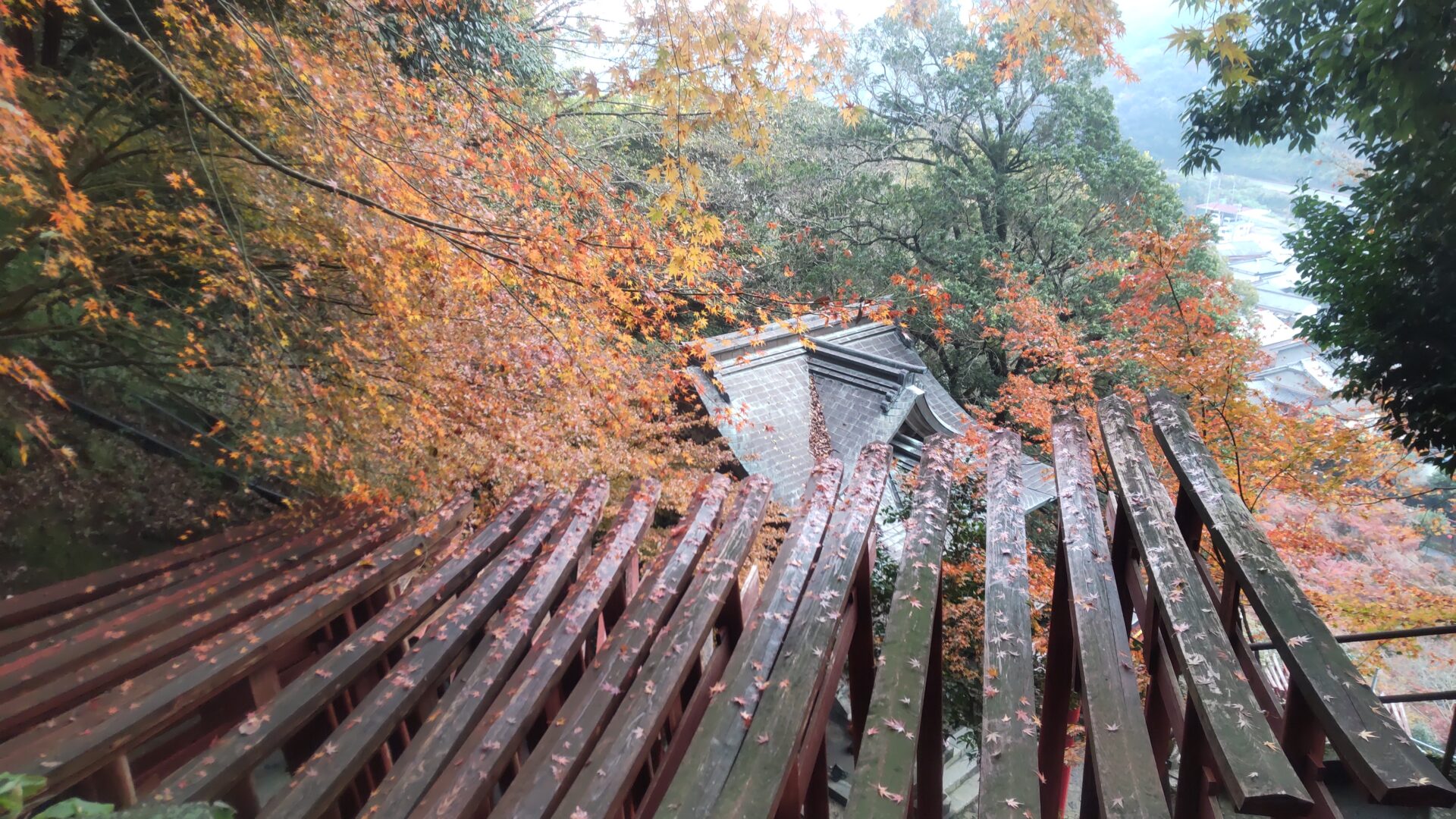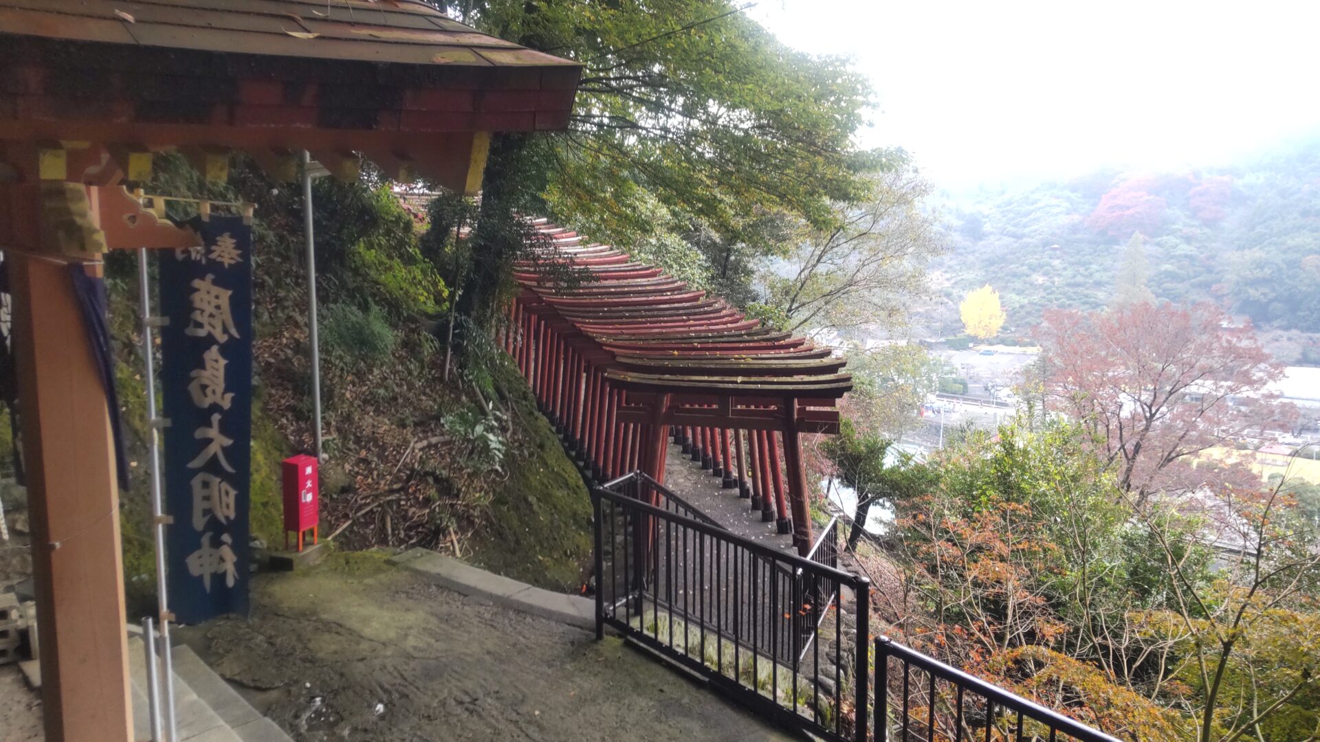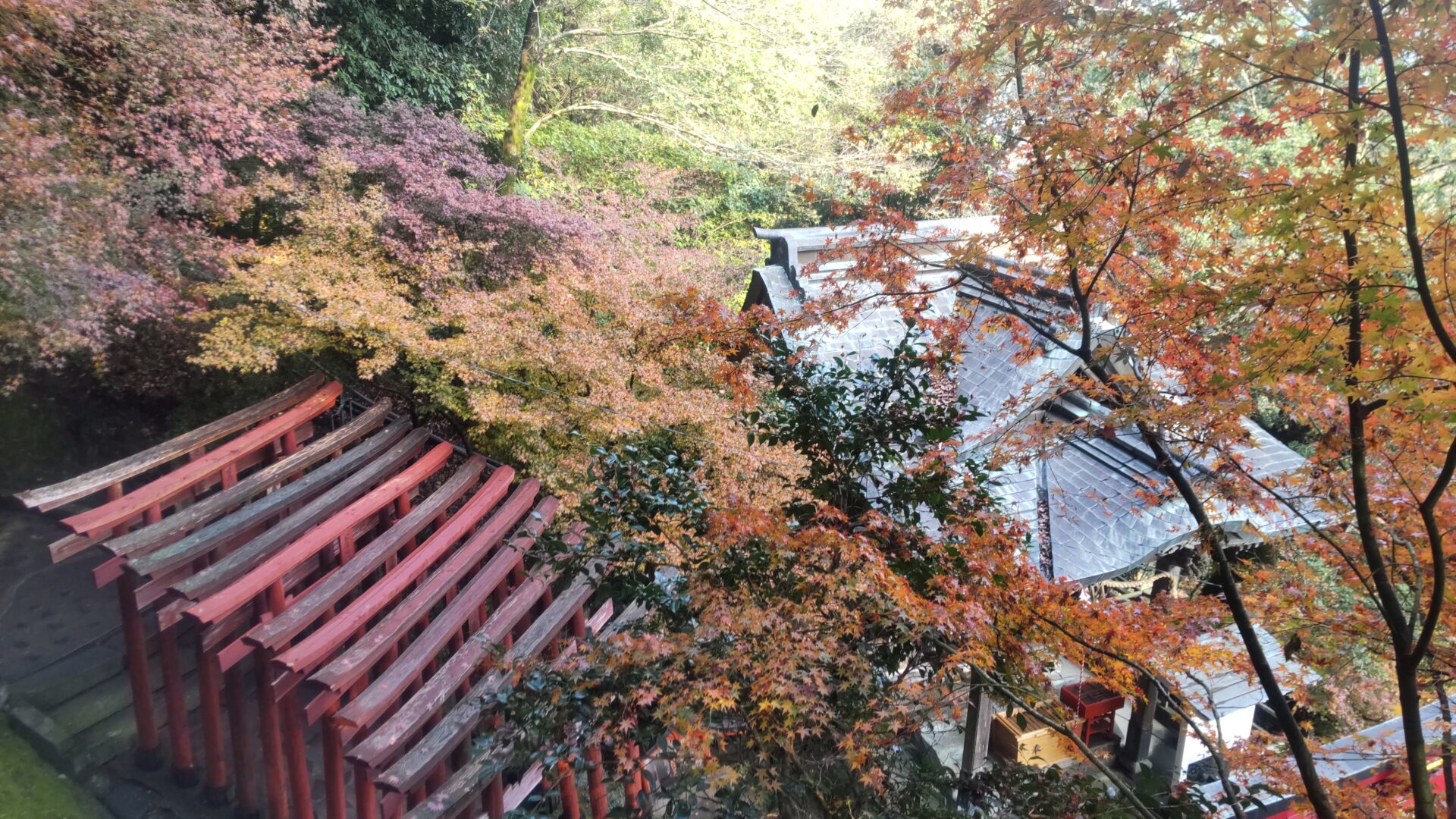 更に上ると、鳥居と紅葉を見下ろせる。