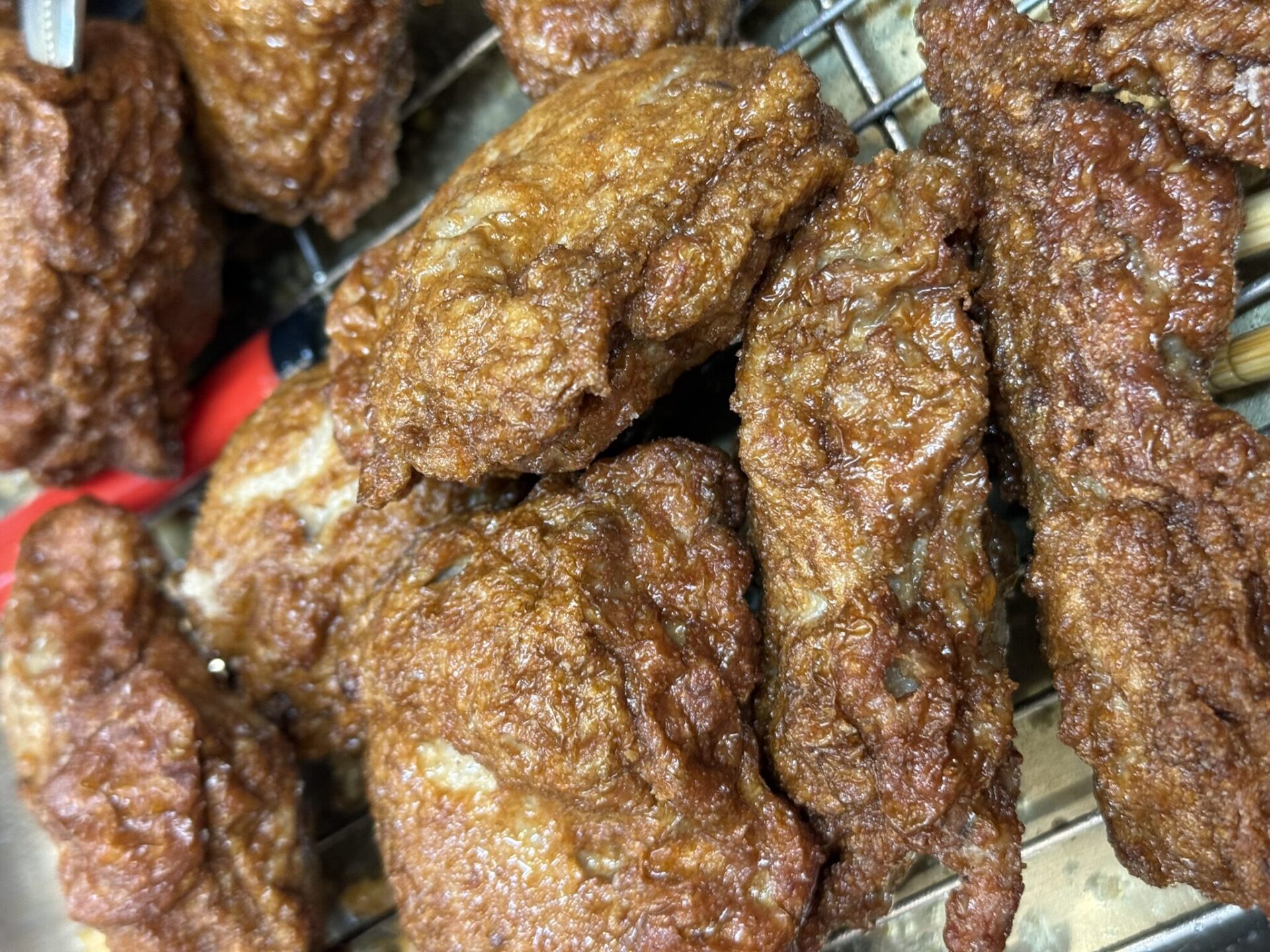 「たたき」は火が通ると、重曹の効果で、ふわっふわに膨らみます。揚げ加減は色で判別します。かなり濃い色になるまでしっかり揚げるのがポイント。下の動画で実際の揚げ加減がわかります。