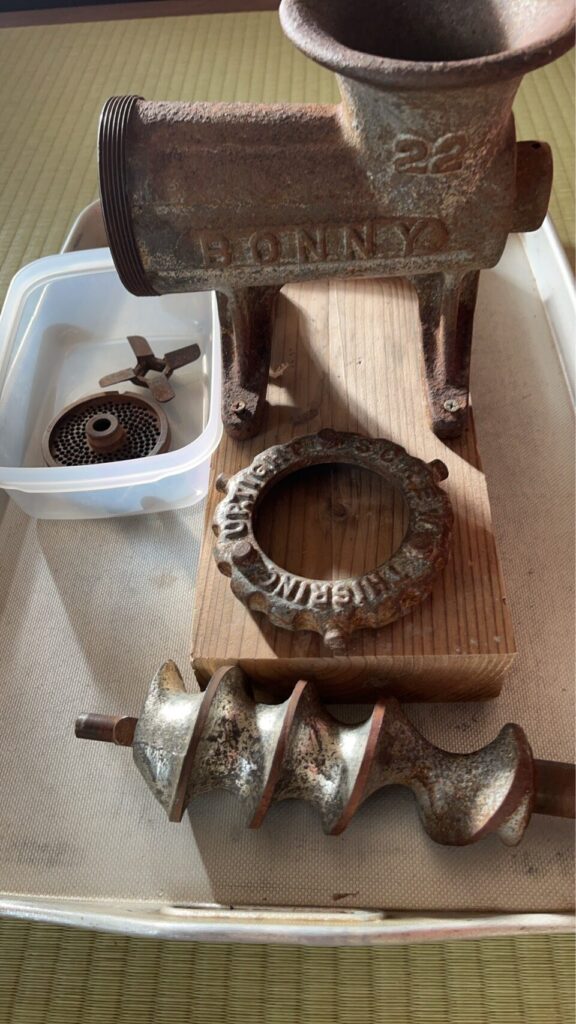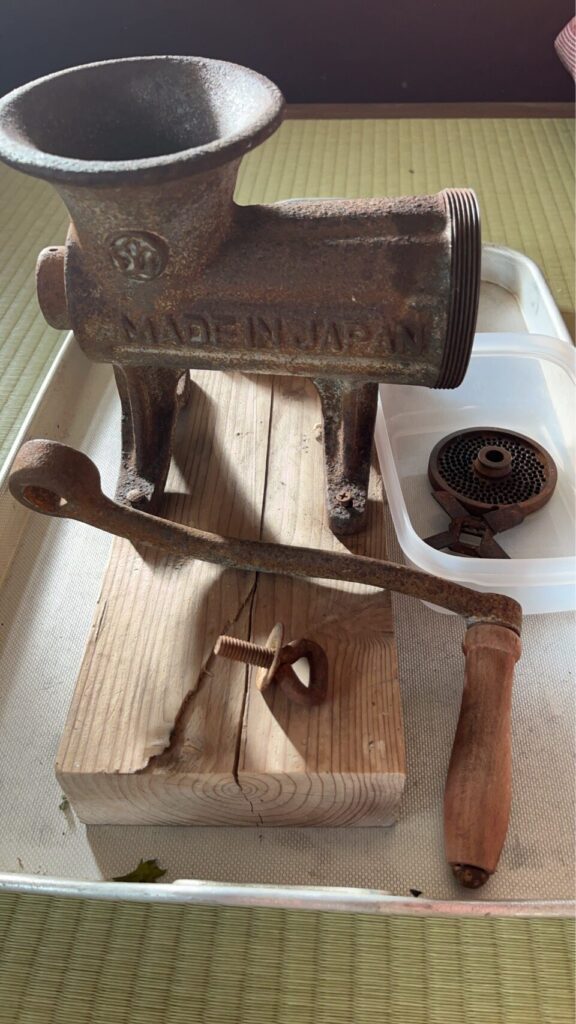 高額な調理器具ですが、日本では食の洋風化に伴って、高度成長期に広まりました。この「肉すり機」は、大阪に現存する株式会社ボニーの準業務用手廻し式ミンサーNO.22です。同社沿革から推測すると、おそらく1970年代に海を渡って式根島に到来したのでしょう。