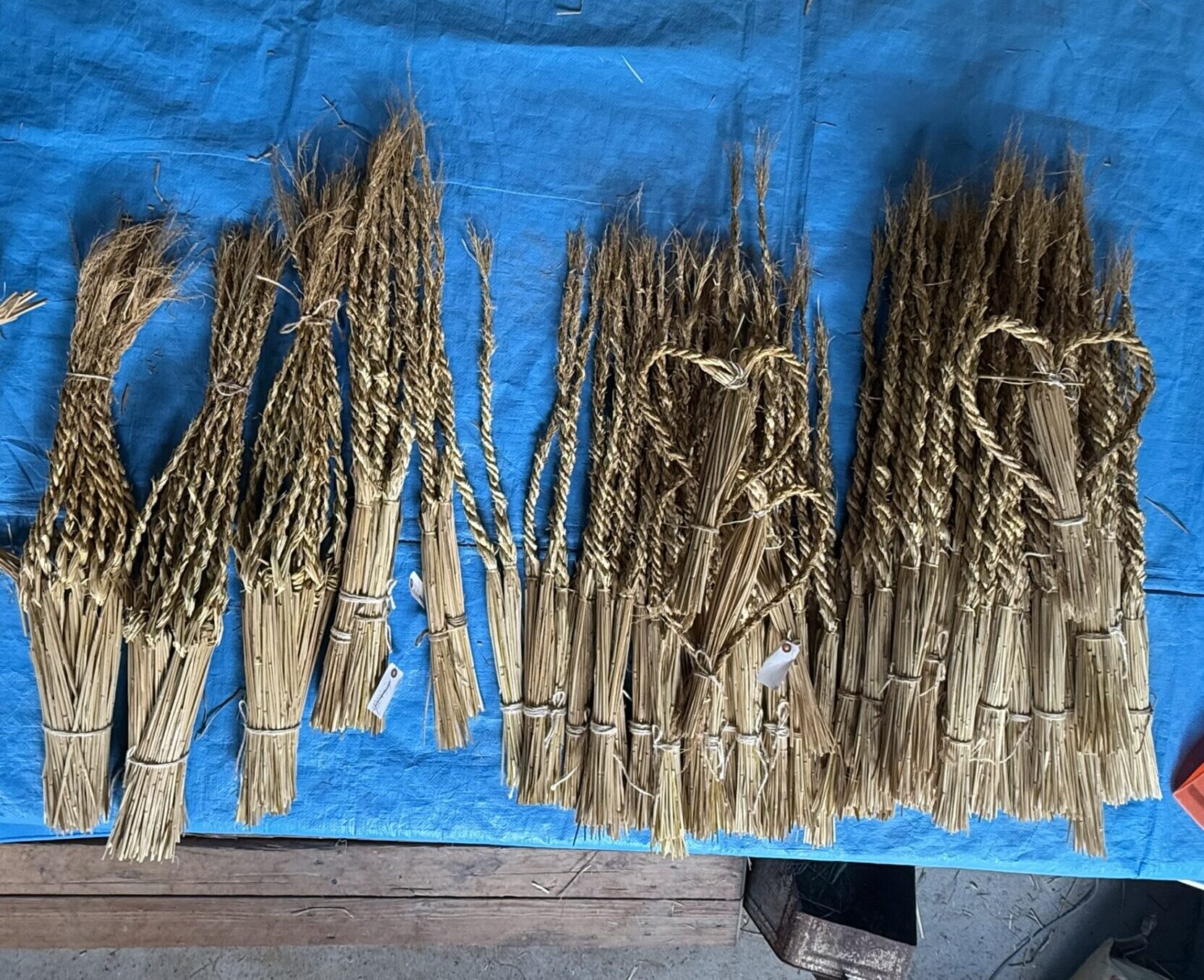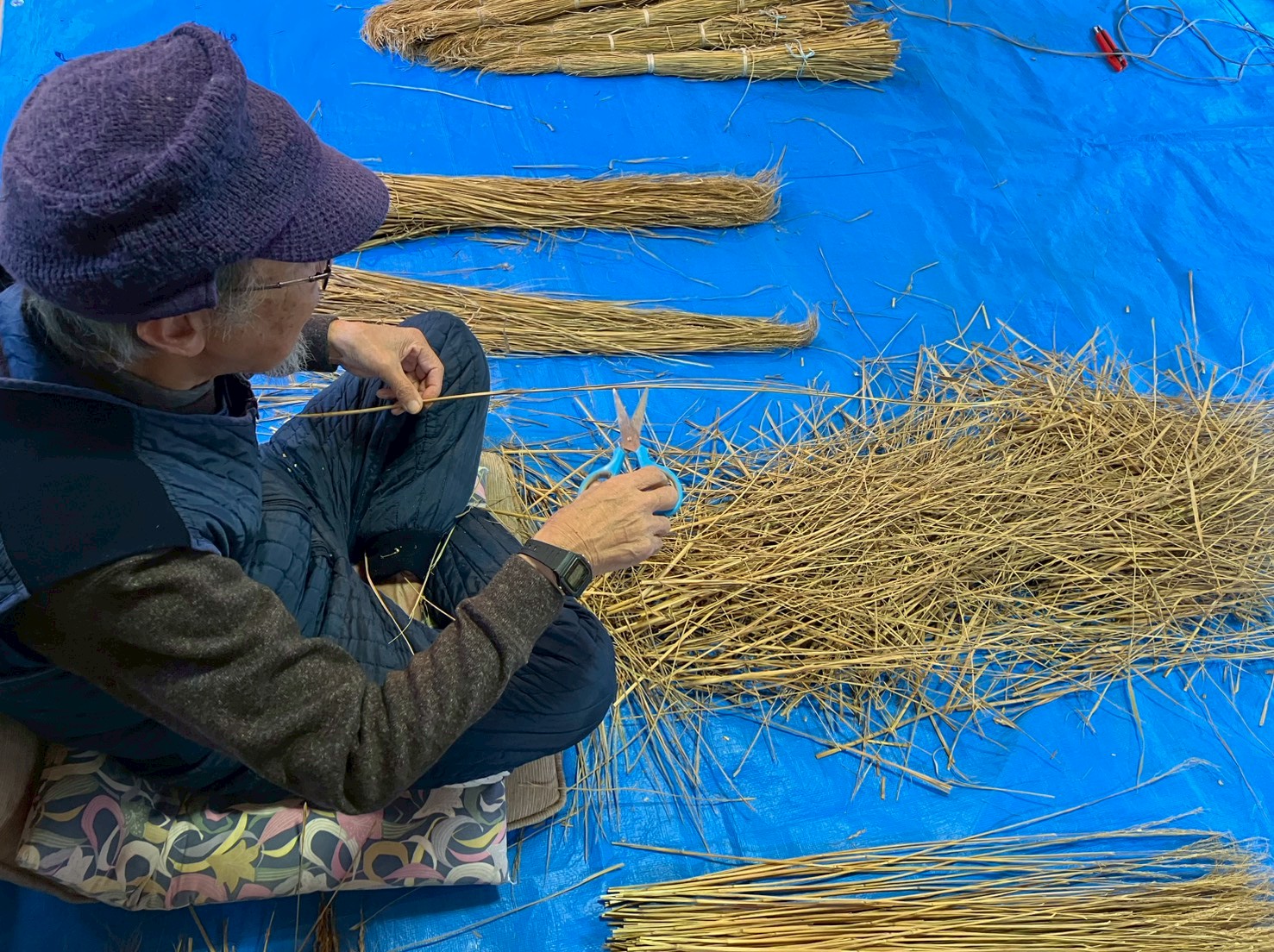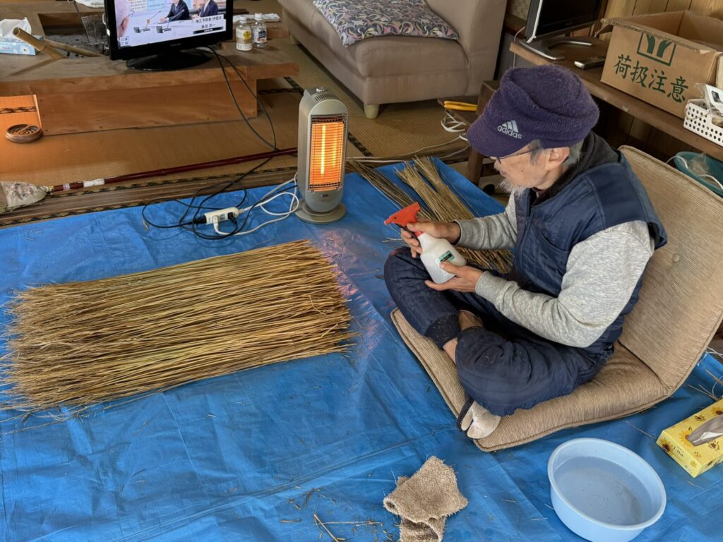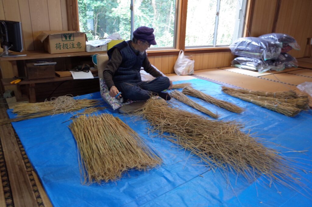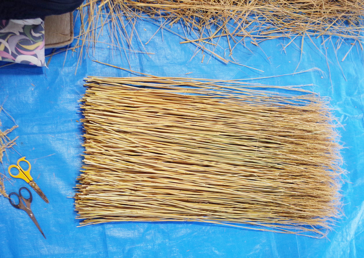 100回叩く。これを1つ1つ、ハサミで余分な葉やケバなどをとって整理します。芯をぬいて藁が使いやすく整った状態
