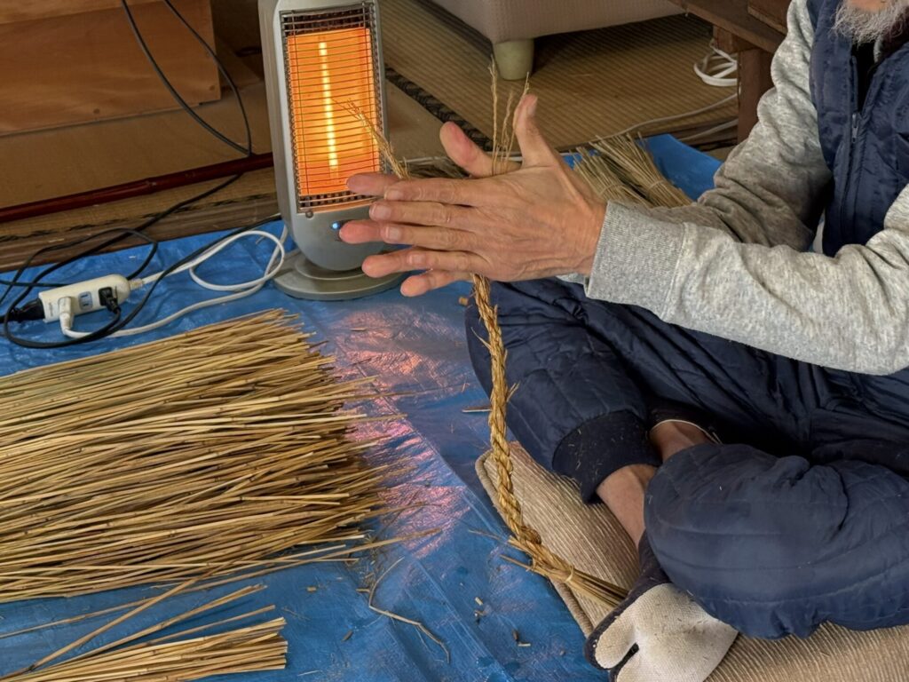 簡単そうに見えますが、大変技術がいる作業です。濡れた藁を長時間手のひらでこすり合わせるので、手のひらが傷んでしまいます。