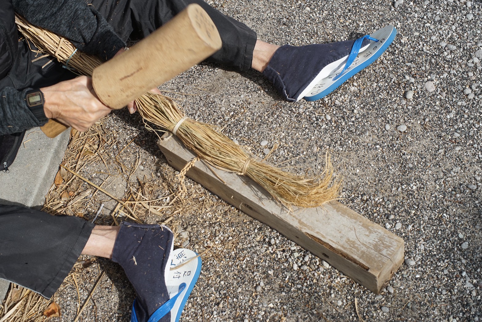 整理した稲藁は、屋外で木づちで100回位を目安に丹念に叩いて柔らかく潰します。潰した箇所がのちほど、手でよって縄にする部分となります。