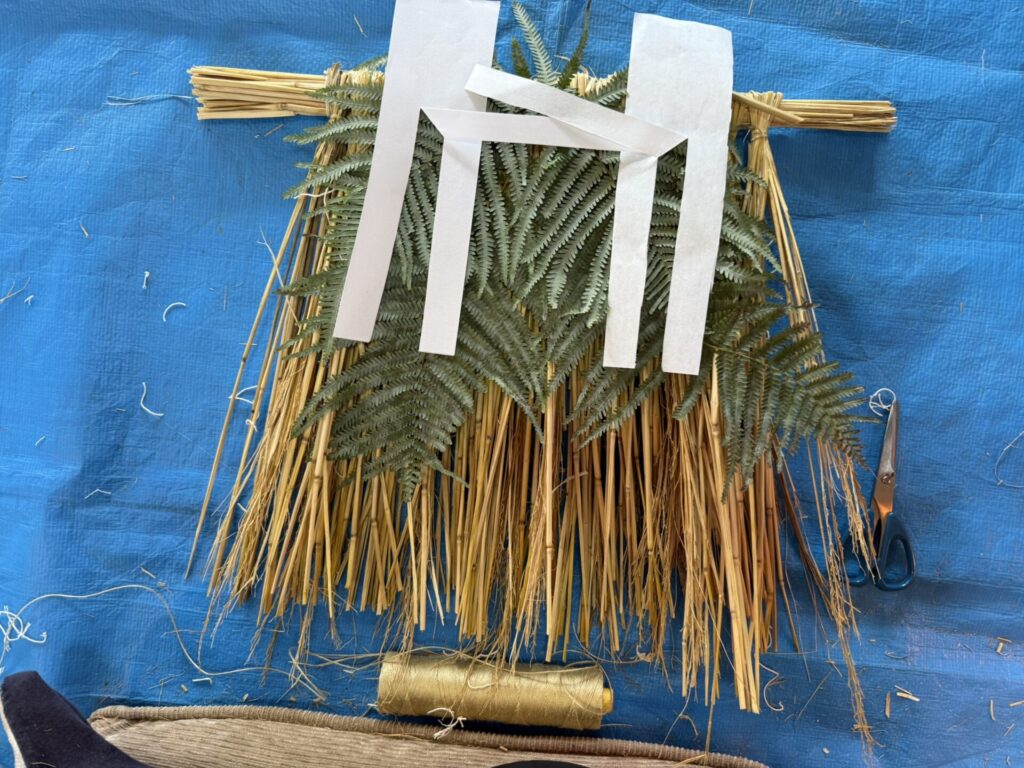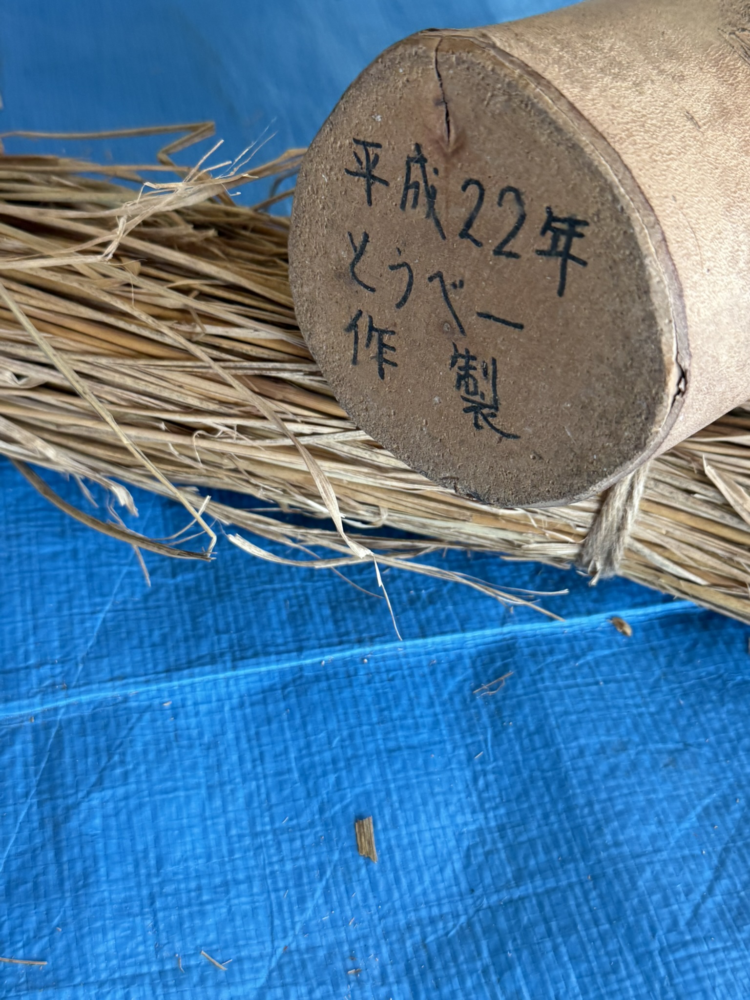 式根島では、稲藁が手に入らないので、注文します。届くのは、乾いた、脱穀済みの稲の茎です。これを束ねて、3つの紐で結びます。一番下の紐は、これより下は藁を叩かない印となるので、バカという竹で作ったものさしで正月飾りの種類別に位置を厳密に定めます。