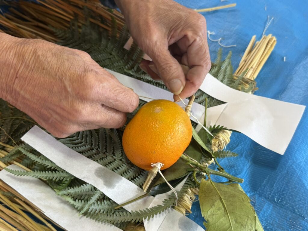 ゆずり葉は半分に畳み、その前面に細い笹竹を突き通した橙(ダイダイ)をあしらいます。のちほど飾りを掛けるのに必要となる糸を結んでおきます。いずれも細やかな作業になります。