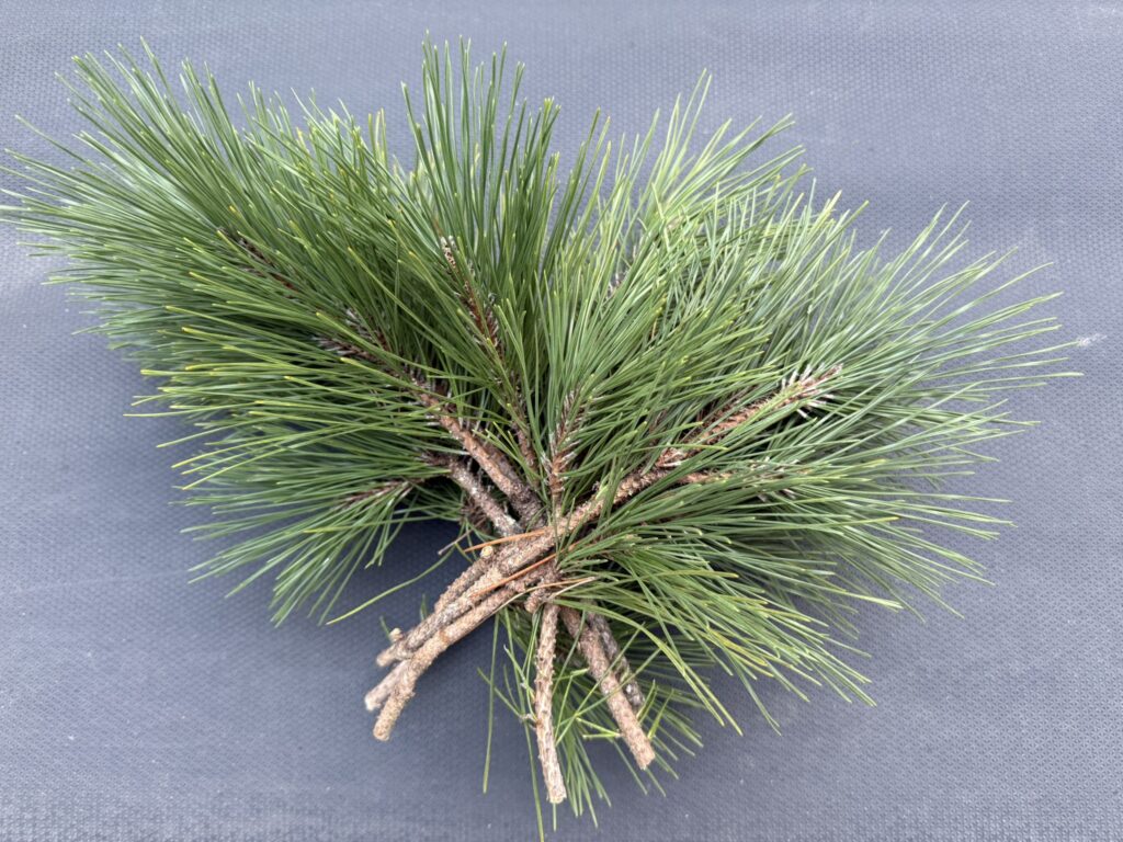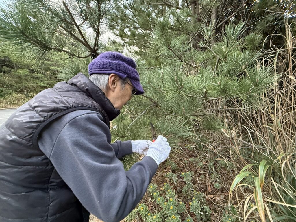 正月に欠かせない松は式根島にたくさん生えています。飾ったときにバランスがよくなるよう、3つに分かれた枝先を採ります。