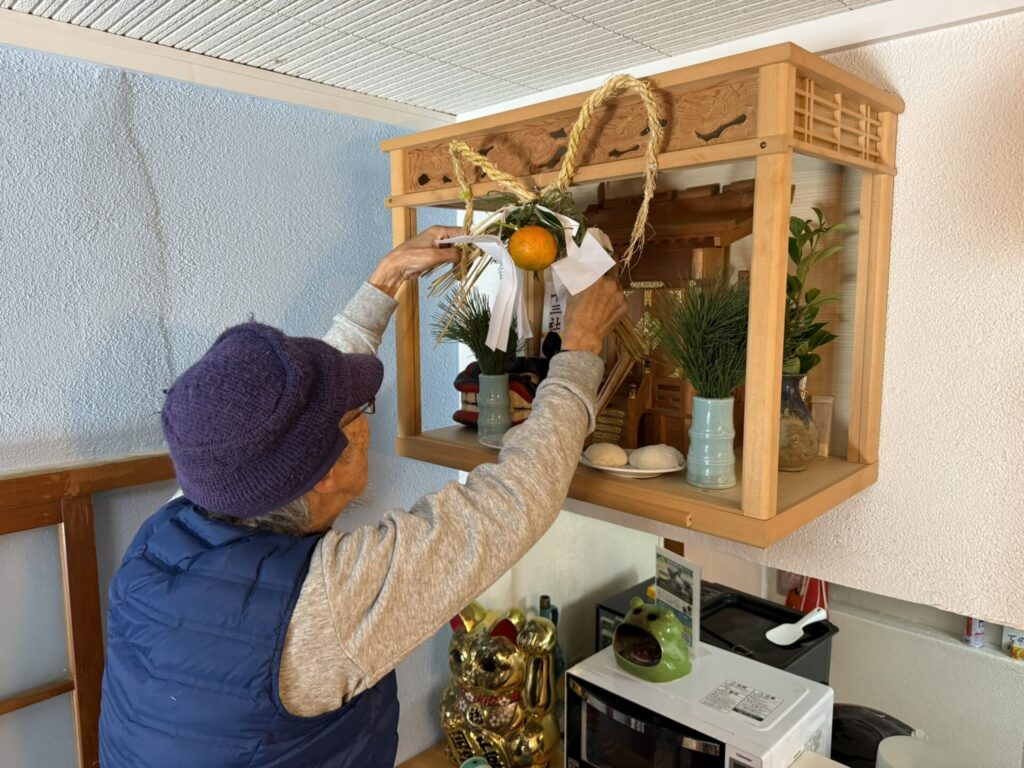 その他の飾りも、どんどん組んでいきます。正月飾りを飾る場所は、島内の神社・祠の全て、寺、仏壇、自宅、関係が深い島民の家や船です。仏壇の仏様が代々栄えては困るので、こちらは橙(ダイダイ)をつけません。