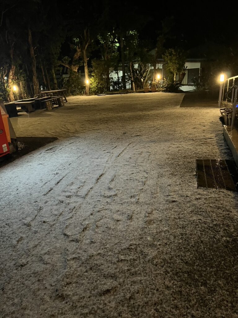 式根島では、8日は昼から、みぞれがパラつきはじめ、雪に変化。20時ごろには、気象庁の予報通り、あたりを白く染めました。雪が降ること自体は、数年おきにありますが、「積もる」のは珍しく、2020年2月10日以来となります。冬でもめったに霜がおりない式根島。寒さに慣れない島民は、芯から冷えて戸惑う雪の夜でした。
