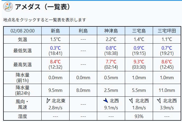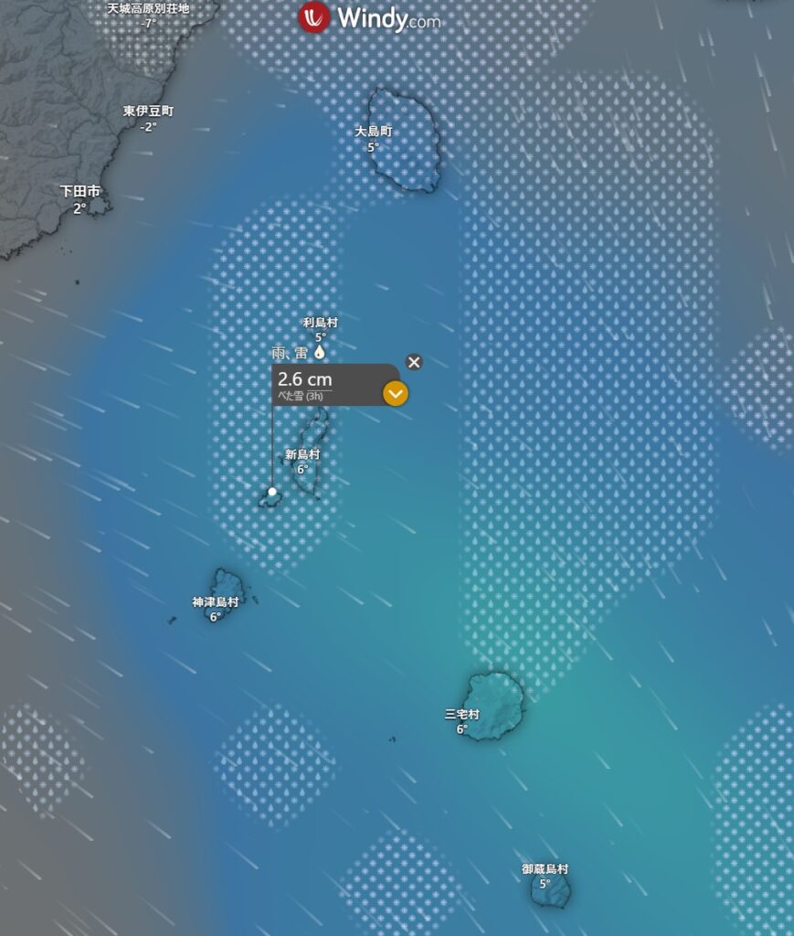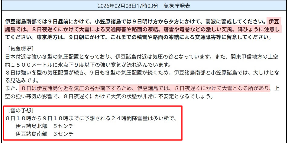 2026年2月8日日曜日。気象庁より、伊豆諸島で夜遅くにかけて大雪になるところがあると発表がありました。黒潮に包まれた海洋性暖地気候の離島では珍しいことです。