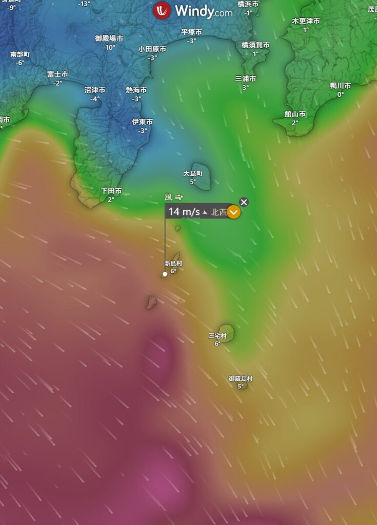 今回の降雪は、南岸低気圧がもたらすボタ雪ではなく、強い冷気を伴う冬型気圧配置によるものということで、式根島にいつもより軽い雪が降りました。8日20時頃のWindyでも式根島上空1500mに-9度の冷気と雪雲、風と風がぶつかりあう収束帯が伊豆諸島に伸びているのがわかります。SNSの反応によると、この帯に沿っている大島と三宅島がしっかりめに雪が降った印象です。