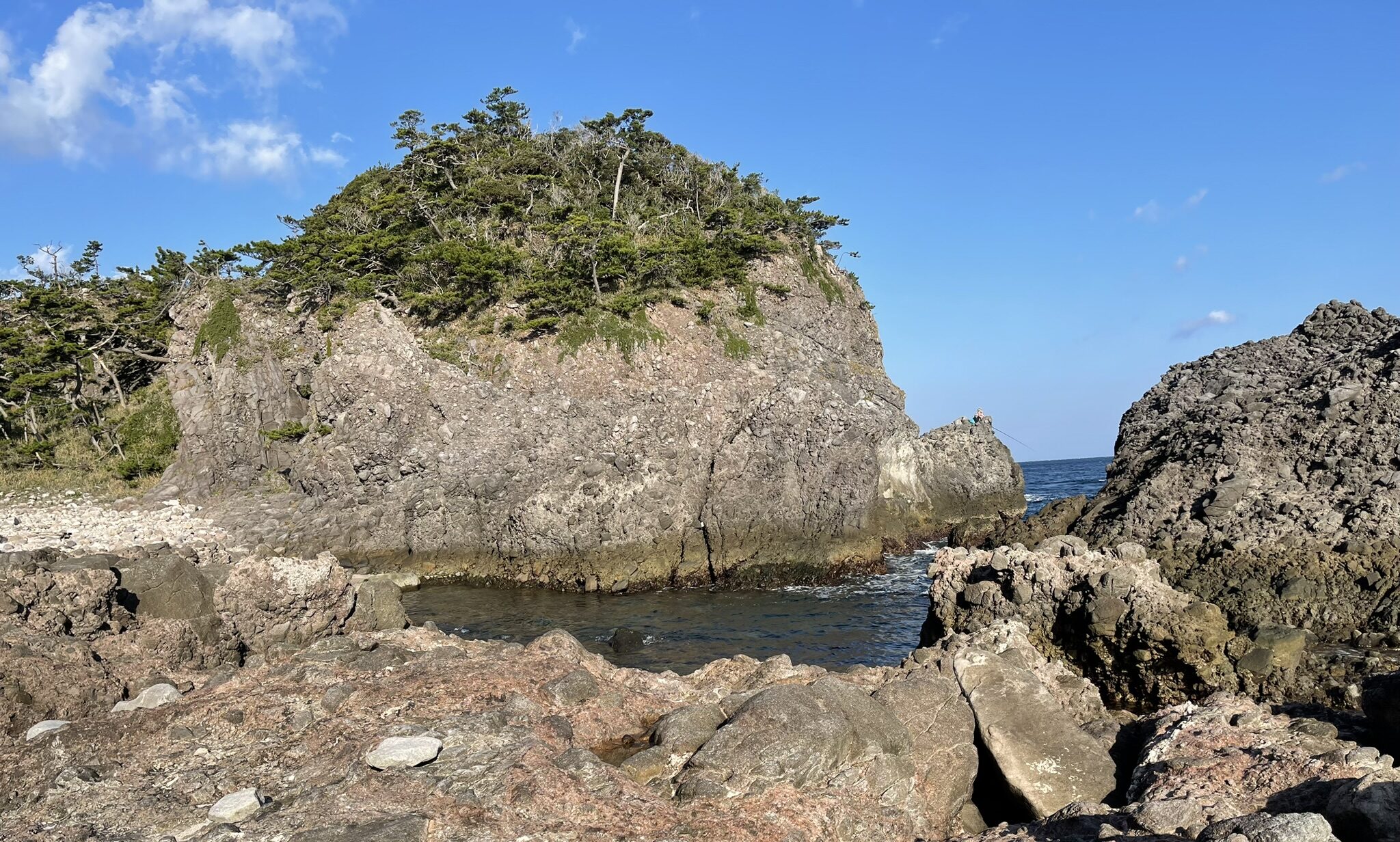 そこで、私一人で「風裏」になる磯を探すことにしました。普段から山歩きをしており、足元は軽登山靴ですし、GPSもあるしで、気楽です。車道から草がうるさい小道を分けて海岸に降り、目的の磯に向かってゴロタ石の海岸を歩き始めました。やがて、目的地に到達するには、足元に波が渦巻く岩の割れ目を飛び移ったり、横向きになって岩をつかんで移動する必要があることに気づきました。