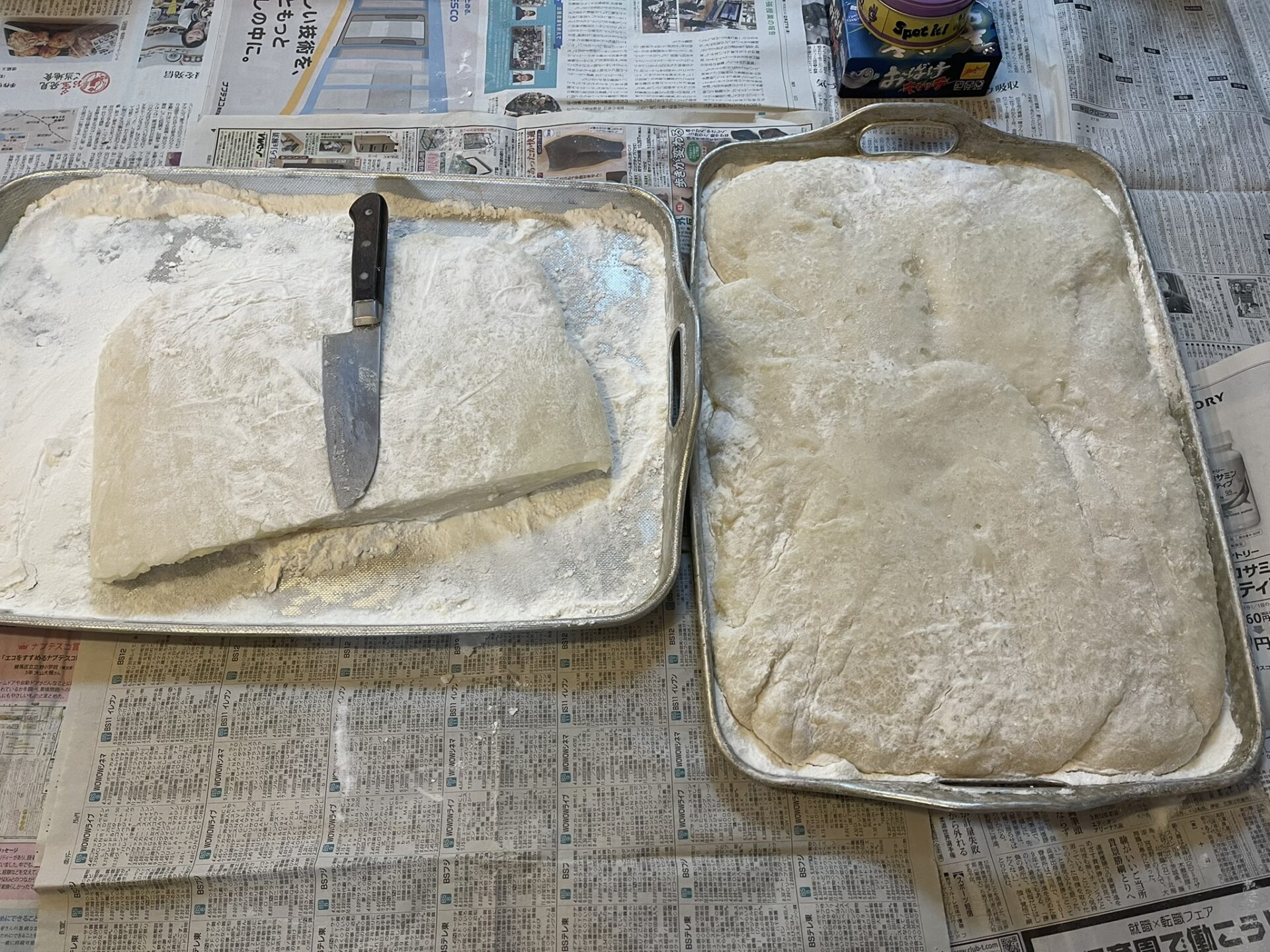 というわけで、みやとらで伊達巻用の玉子4パックを買い込んで、ひだぶんに到着すると、泊まり客は少ないものの、台所に大きなボウルや鍋が積み重なっています。