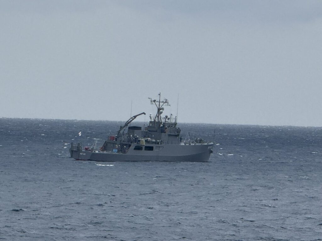 帰りのさるびあ丸から見た海上自衛隊の水中処分母船。危険な水中処分隊(機雷や不発弾、水中の爆発物処理など、危険な潜水作業を行う水中処分員の部隊)の支援を行う母船だそうです。働く船との出会いも、船旅の醍醐味です。